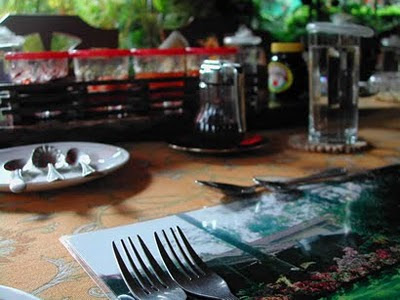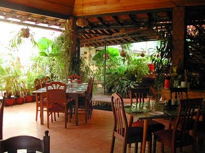 The open dining area surrounded by lush greenery.