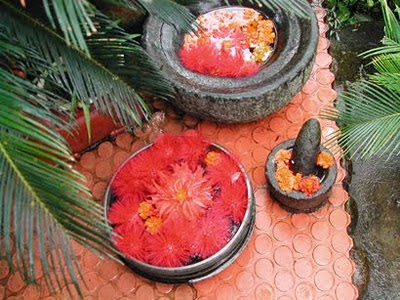 Flowers floating in traditional Kerala Urlis and stone mortar & pestle..